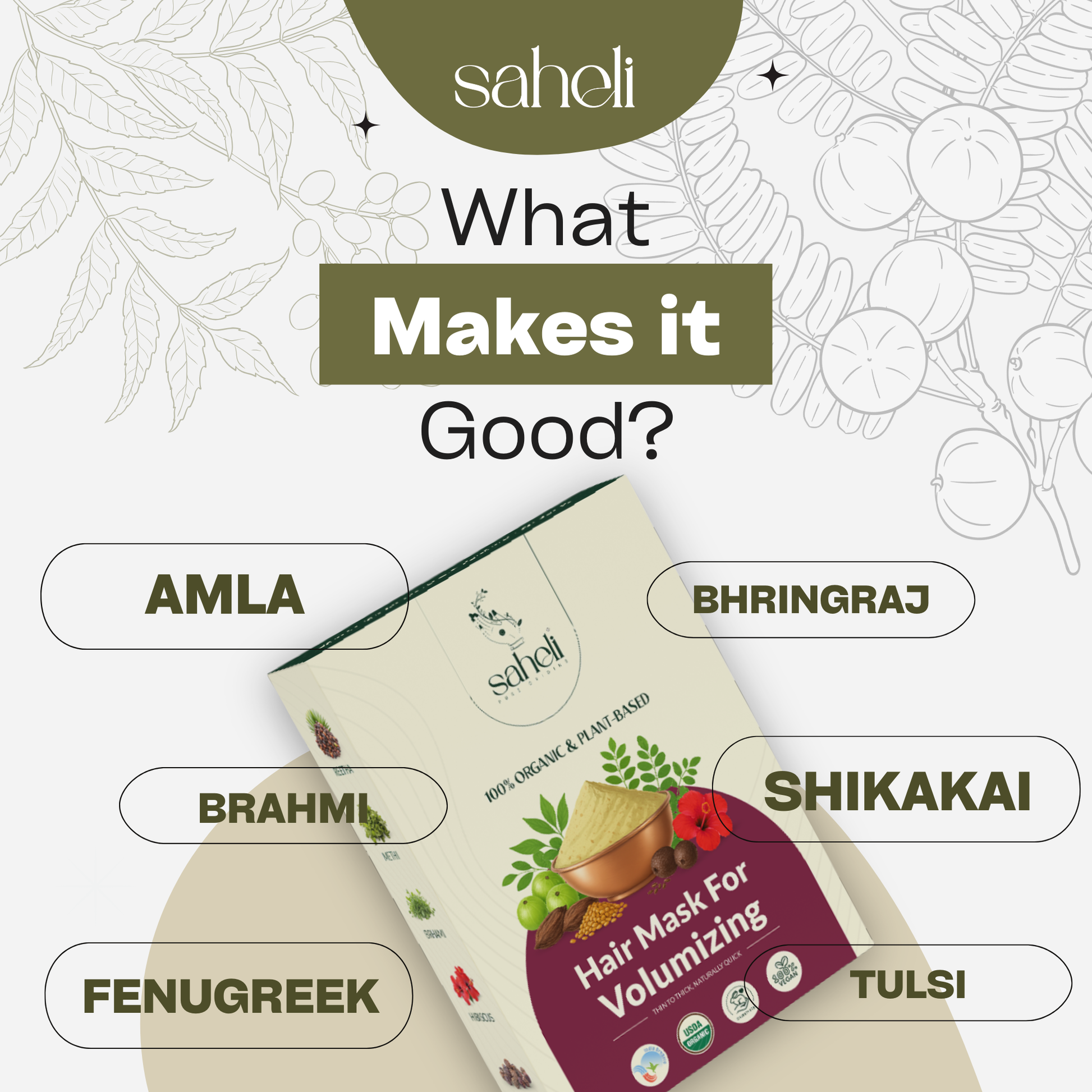 Saheli 100% organic and plant-based hair mask for volumizing is a powerful blend of 9 Ayurvedic herbs crafted to naturally boost hair volume, strength, and vitality. Made with amla, bhringraj, brahmi, shikakai, reetha, hibiscus, fenugreek, moringa, and tulsi powders, this mask deeply nourishes the scalp, strengthens roots, and promotes fuller, thicker-looking hair. It helps reduce hair fall, adds natural bounce, and improves overall hair texture without any chemicals or synthetic additives. Free from parabens, sulfates, and artificial fragrance, this hair mask is your go-to natural remedy for achieving healthy, voluminous hair with a vibrant shine.