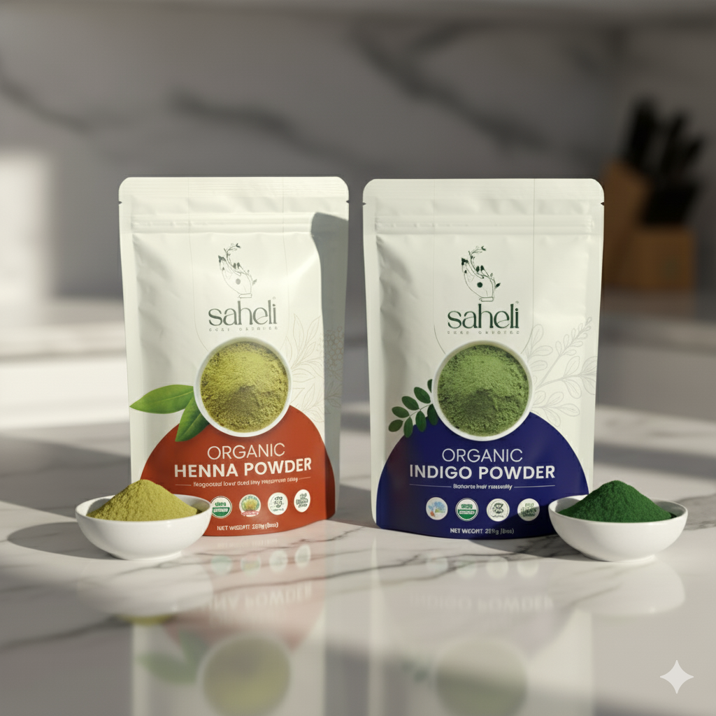 This Henna + Indigo Combo offers two separate packets—Herbal Henna with 9 Ayurvedic herbs and pure Indigo powder—sold together in bulk for value, not pre-mixed. Henna conditions, strengthens, and imparts a warm reddish-brown base, while Indigo used after Henna deepens the tone to rich brown or natural black with added shine and thickness. Mix Henna with warm water or tea, let it rest, apply, rinse; then mix Indigo fresh with warm water and apply for your desired depth. 100% plant-based and free from ammonia, PPD, and parabens.