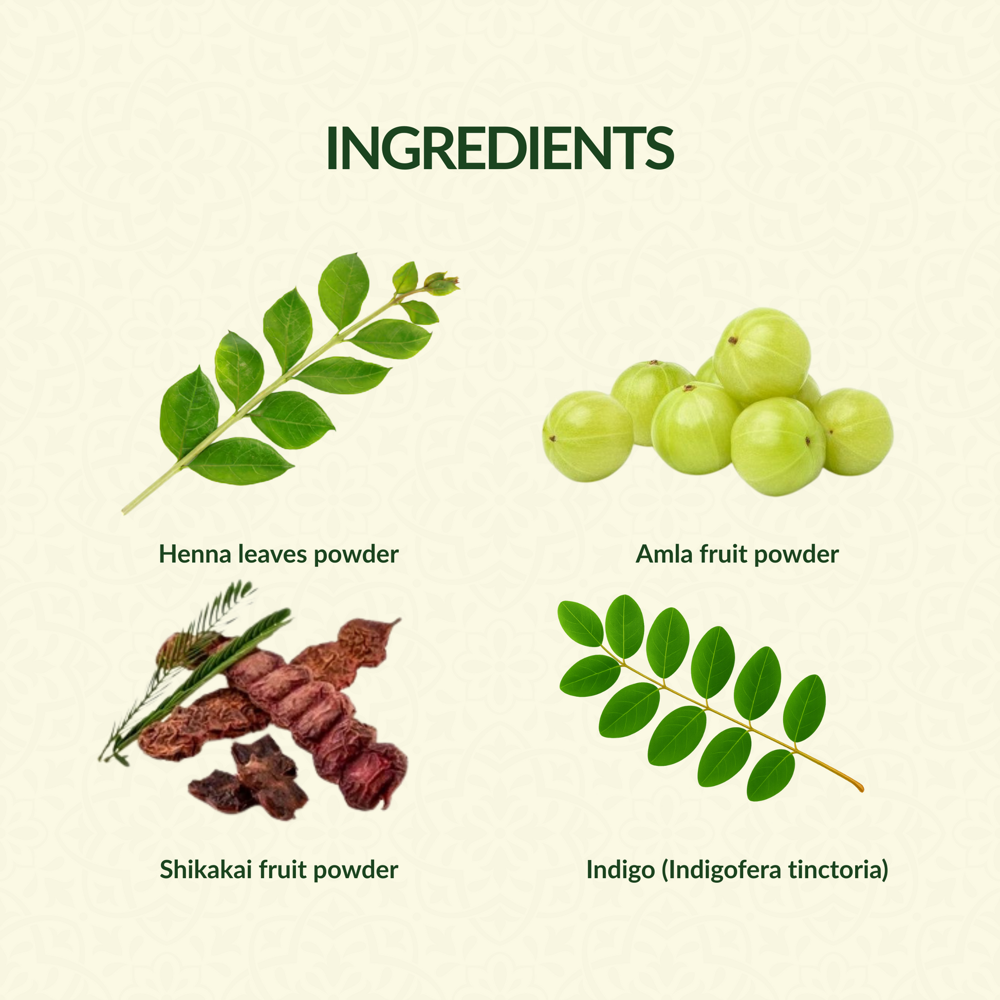 Paste - Henna (Lawsonia inermis) leaves powder, Amla (Phyllanthus emblica) fruit powder, Shikakai (Acacia Concinna) Fruit Powder, Clove oil, Eucalytues oil