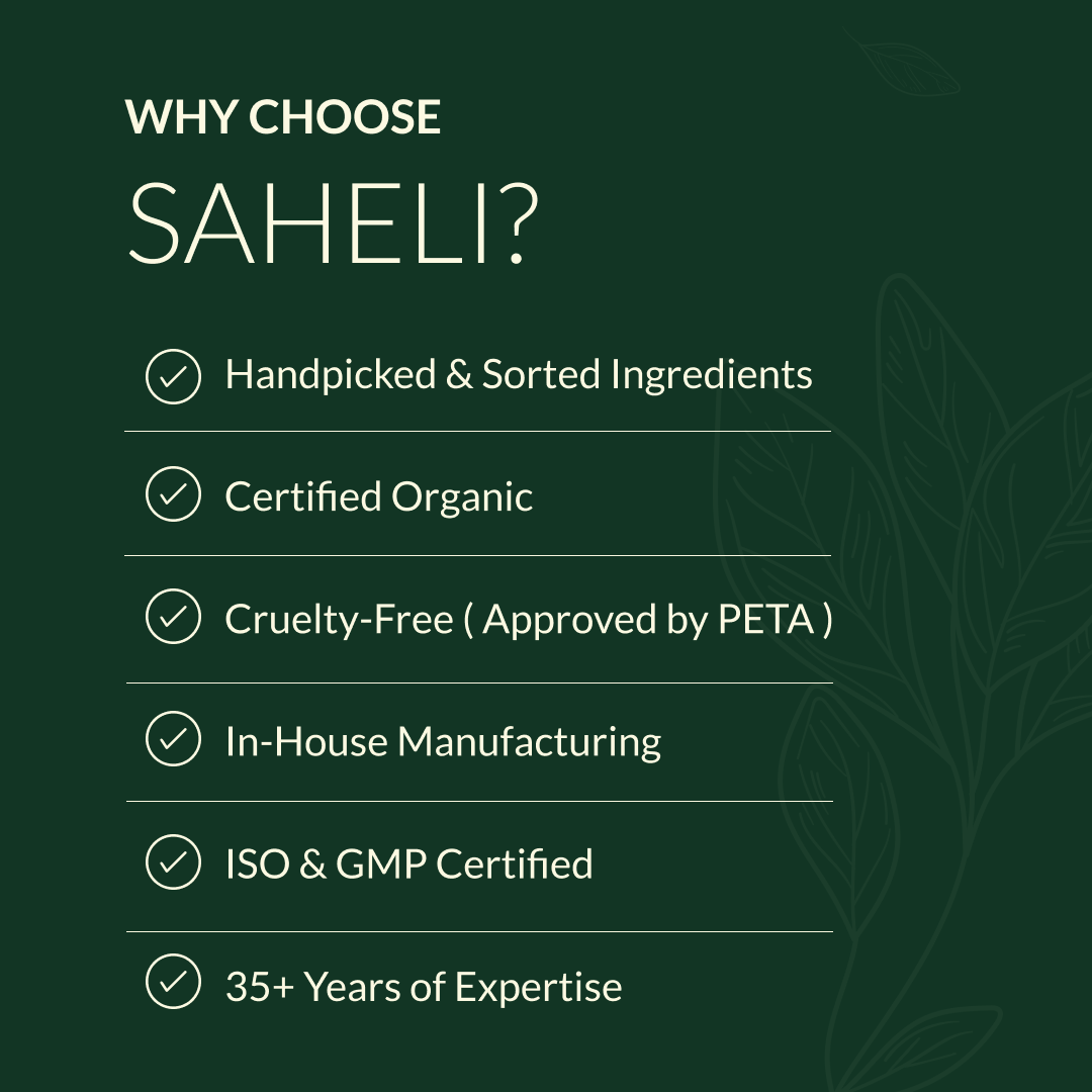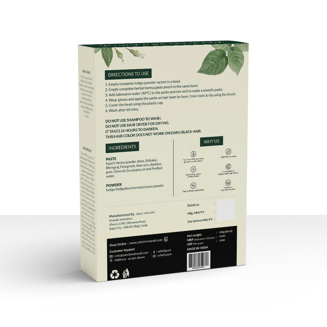 Saheli 100% organic and plant-based herbal hair color - natural black is a single step, chemical free hair coloring solution made with the power of nature. Crafted with herbal henna paste enriched with eucalyptus and clove oil, and pure indigo powder, it provides deep, rich natural black color while nourishing your hair from root to tip. This plant-based formula not only covers greys effectively but also conditions the hair, leaving it soft, shiny, and healthy. Free from ammonia, PPD, and synthetic additives, Saheli offers a safe and gentle alternative for those seeking natural beauty with lasting results. Suitable for all hair types.